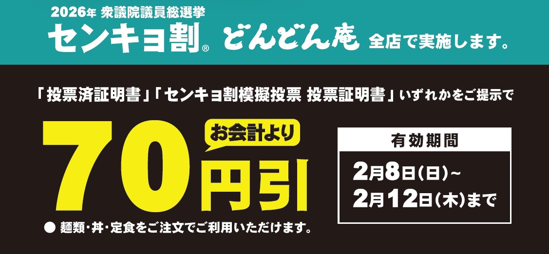 【衆議院議員総選挙】 投票に行ってお得に! 「センキョ割」の実施店舗数を拡大し実施! 期間中「投票済証明書」または「センキョ割模擬投票 投票証明書」 を提示で特典が受けられます。 ※業態により実施期間・サービス内容が異なります。 ※グループ実施業態の全251店舗で開催(一部業態では未実施)