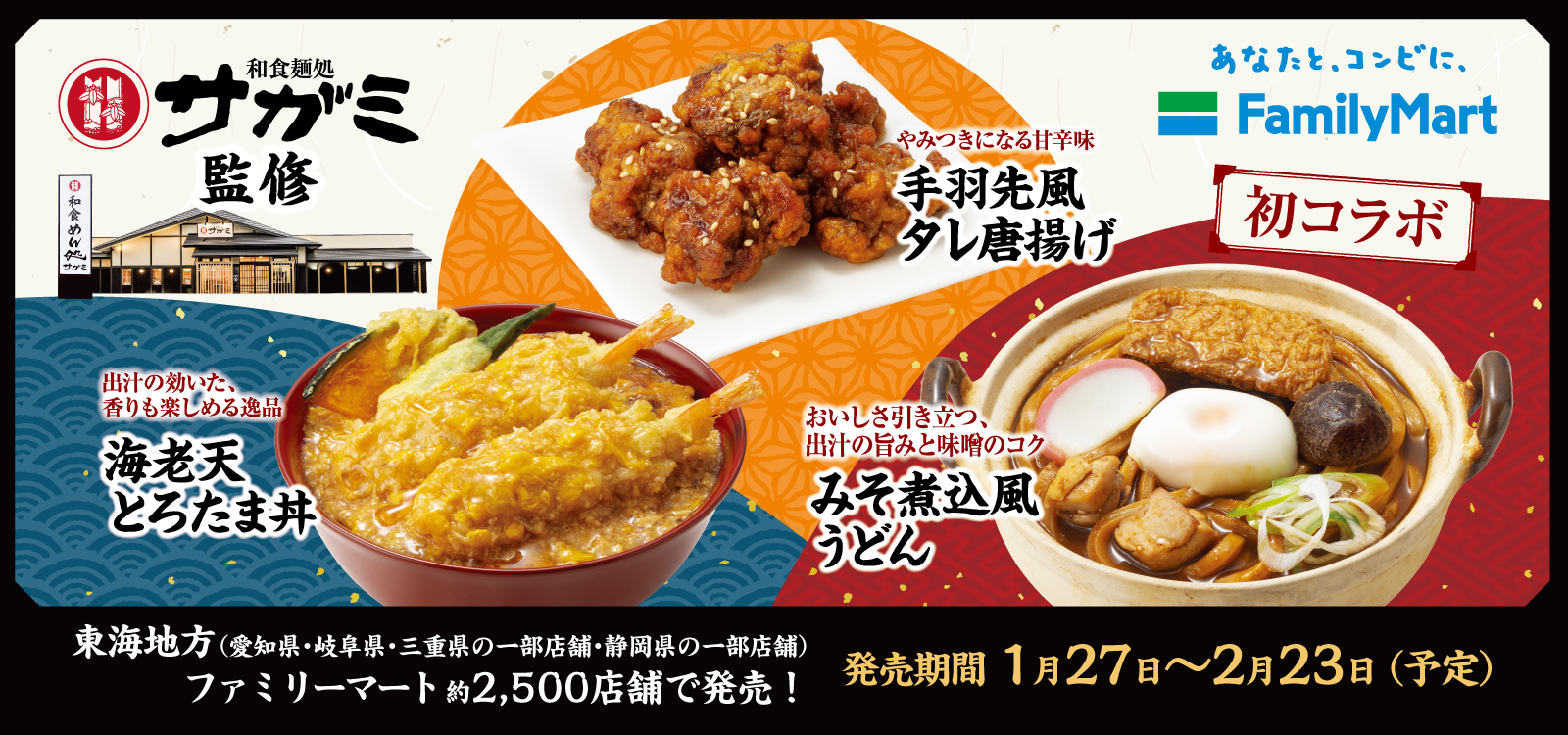 2026年1月27日(火)より、東海地方(愛知県・岐阜県・三重県の一部・静岡県の一部)のファミリーマート約2,500店舗にて 看板メニューの「みそ煮込」をはじめとする計3商品を期間限定で発売いたします 。 ぜひお買い求めください。 商品ラインナップ:みそ煮込風うどん(税込646円) 海老天とろたま丼(税込748円) 手羽先風タレ唐揚げ(税込320円)